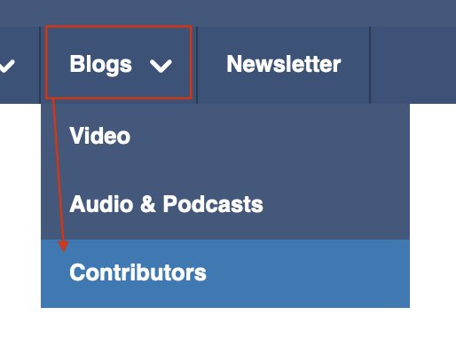 Each blogger has their own blog page which displays your profile details which you have chosen to share as well as any posts which include blogs, videos and audio posts that you have contributed. the Faith and Fitness Magazine website also has a Contributors page showcasing the people who have contributed content. To see the Contributors page, hover over the Blogs top main menu item in the public facing website and then choose Contributors from the drop-down menu.