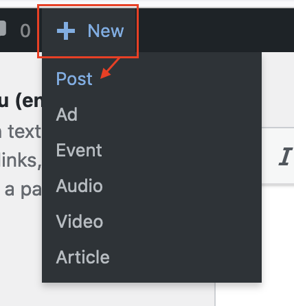 To create either a Video or Audio post, visit the + New in the top administration bar and choose either the Audio or Video entry in the drop-down.
